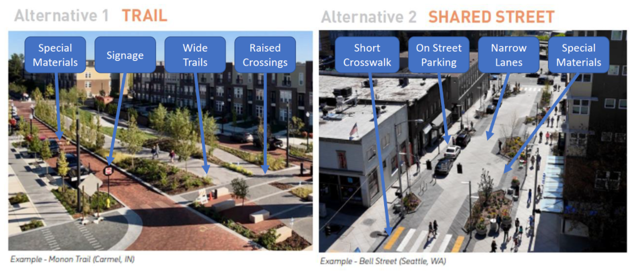 There are currently two options for the trail's 21st Street segment. The first option is the “trail” design, which would close the street to motorists (excluding emergency vehicles) and create a shared trail for cyclists and pedestrians. The second option is called a “shared street” in which cars would be allowed.