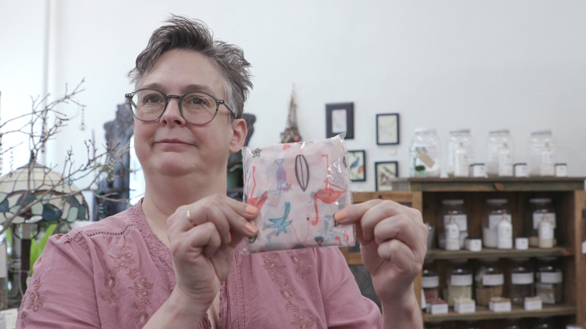 Today, she’s also selling artsy reusable bags at the counter.