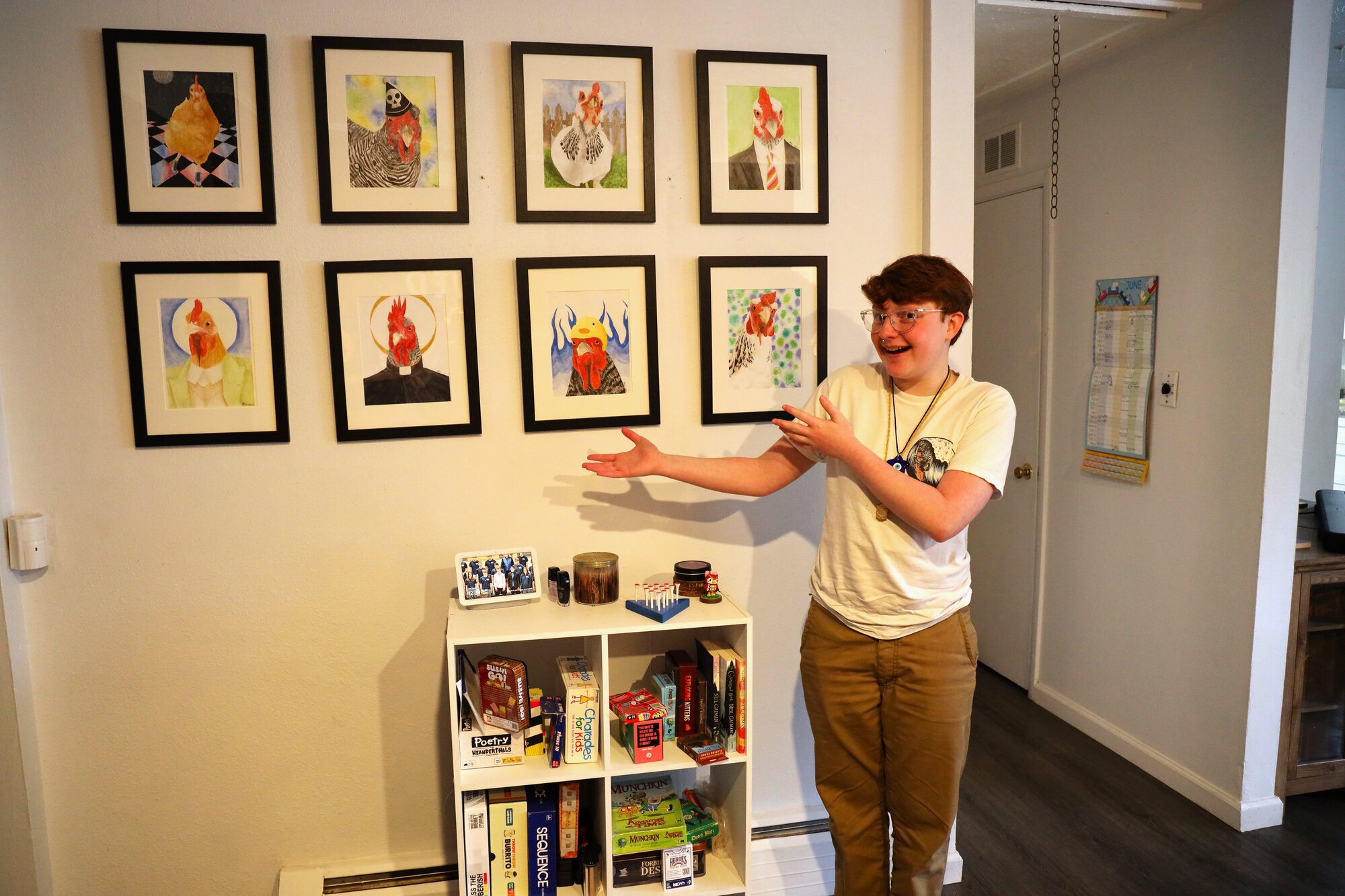 Alec, 15, stands next to his watercolor paintings of the family’s chickens. (Elle Naef/Rocky Mountain PBS)