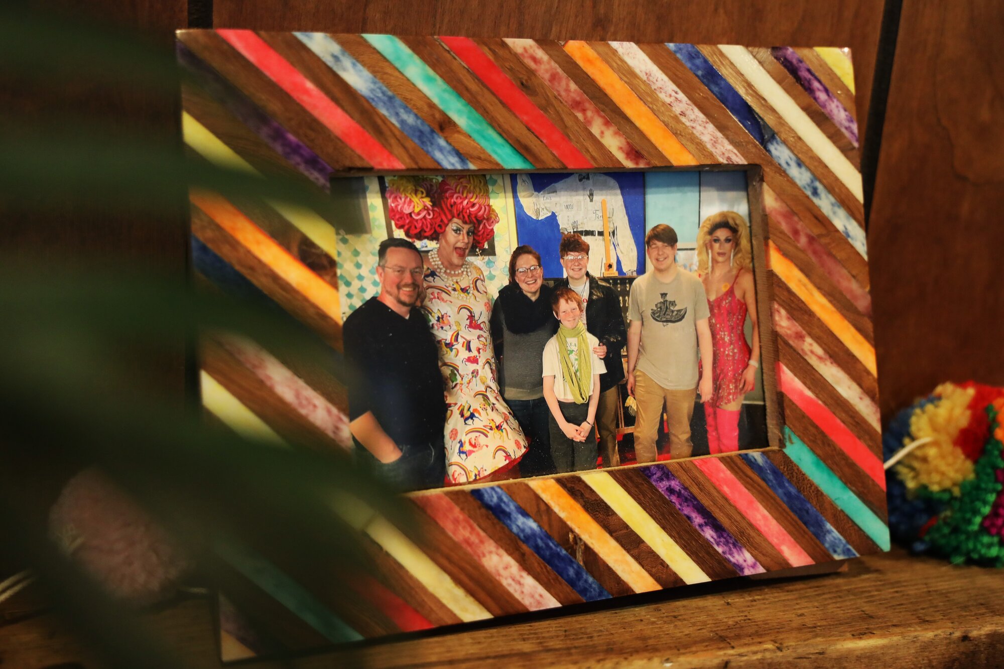 Alec, Lucas, Sara and other family members pose together next to drag queens. (Elle Naef/Rocky Mountain PBS.)