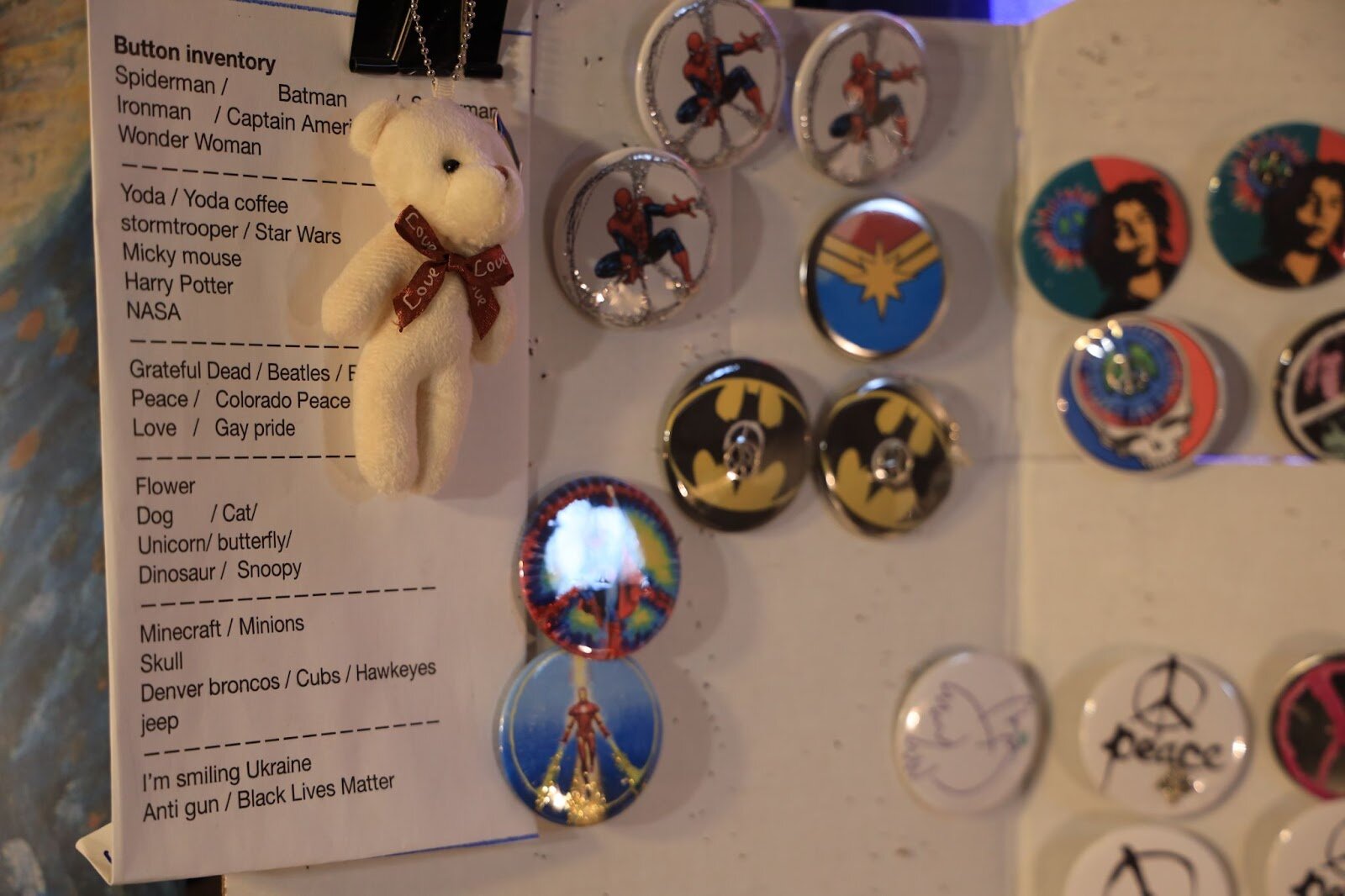 Howes has boards full of home-made, self-designed buttons.