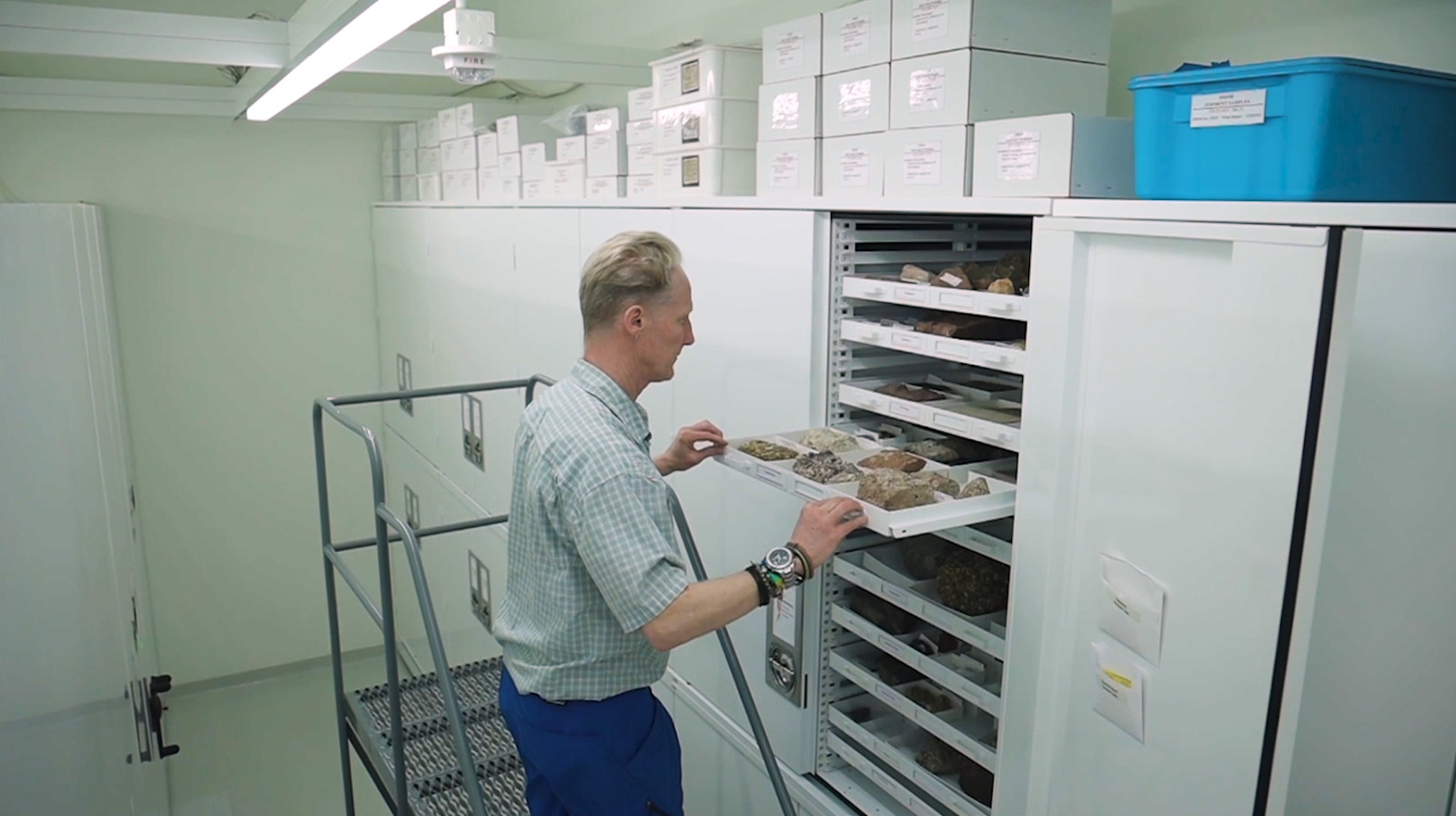 Dr. Hagadorn opens one of the Denver Museum of Nature and Science’s underground storage shelves containing tons of rock samples.