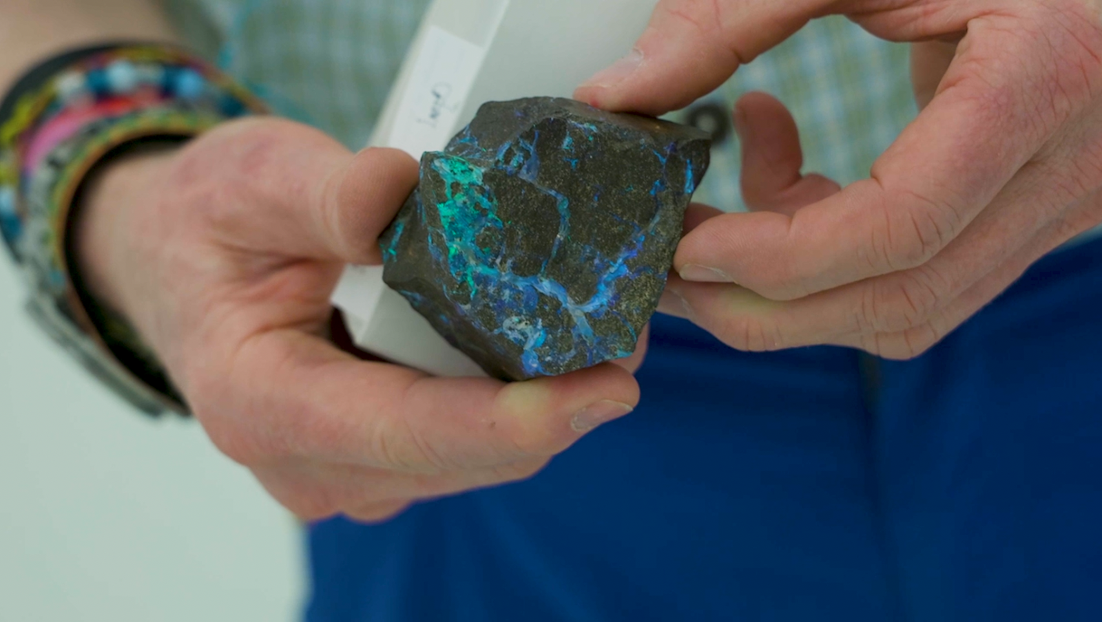 Dr. Hagadorn models an opal sample from Australia.