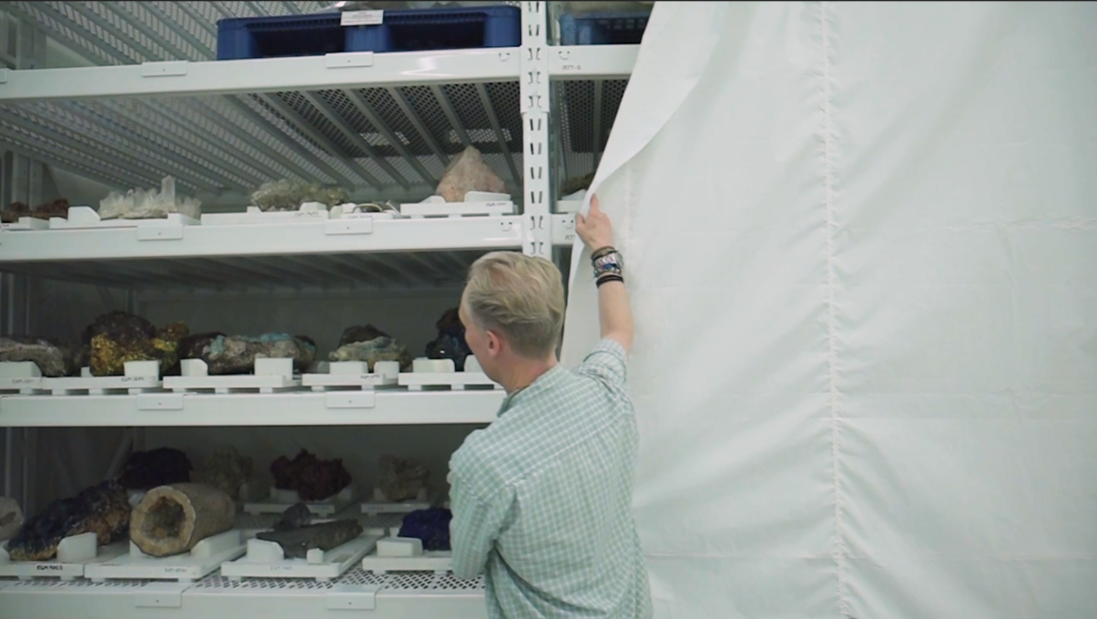 Dr. Hagadorn closes the curtain on hundreds of the museum’s rock samples.