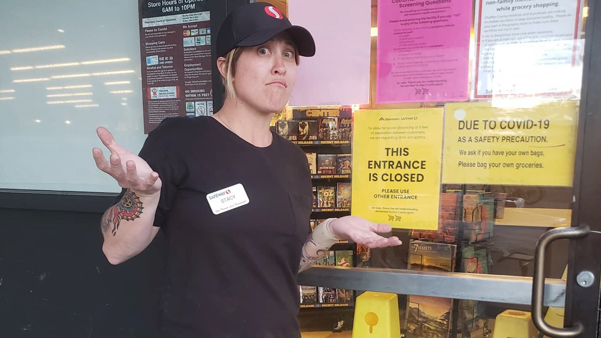 Falk was introduced to us via Facebook, where she posted a video of herself and a friend skating at the store. Roller skating. “When I moved here in September, I got recruited to the roller derby team pretty quickly,” she says, “and then all of this happened and the skate parks got closed.” Her friend and fellow skater also worked at the grocery store. When they both worked a night shift, Falk suggested they skate the store while working. “So one night we just put our skates on and went in and that’s kind of when it started.”