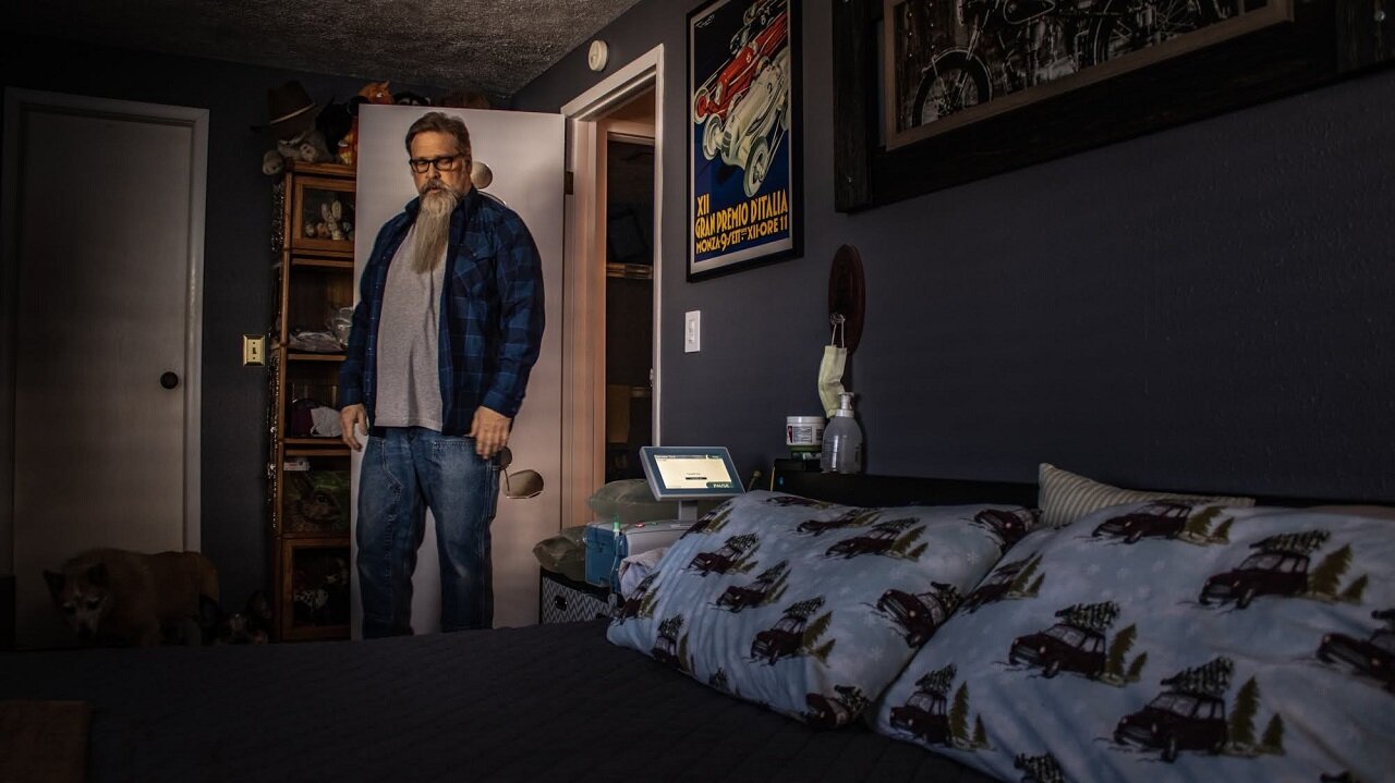 Charlie Bigsby eyes the dialysis machine he is connected to for 10 hours each night, at his Longmont home on Saturday, Feb. 4. Photo by B Goodell, Unboxed Photography.