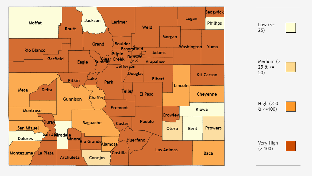 What's more, cases are increasing statewide. According to CDPHE, from March 14 to March 27, a majority of counties in Colorado experienced "very high" incidence of COVID-19 cases, as you can see in the chart below.