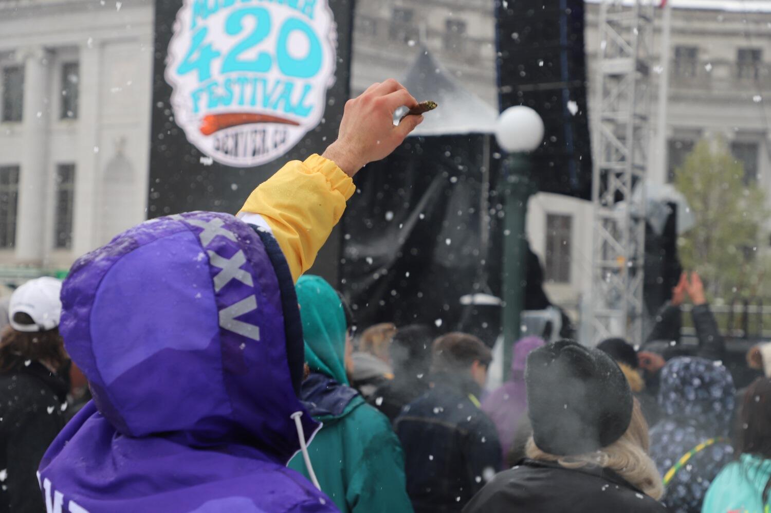 An attendee at the Mile High 420 festival holds a lit joint.