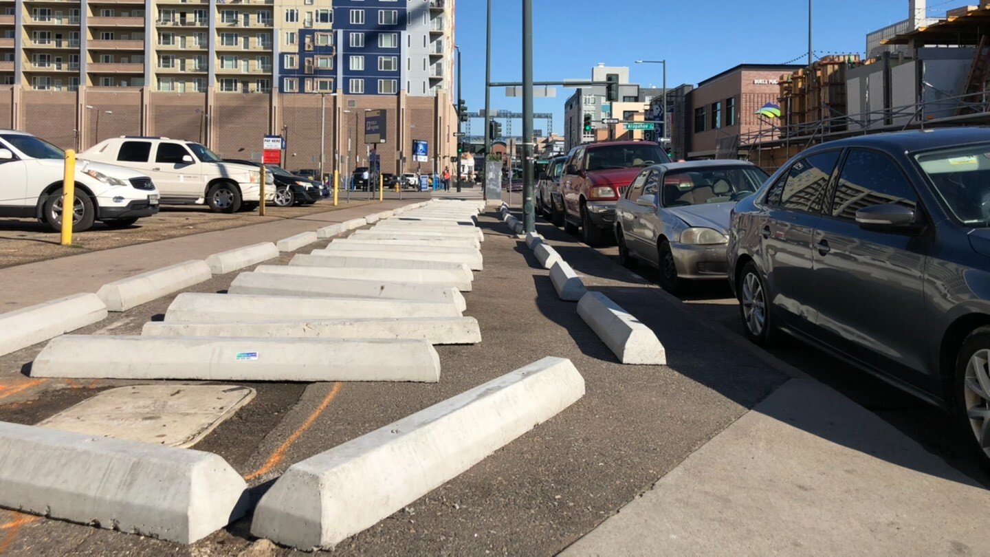 DENVER — At the intersection of 21st and Arapahoe St., right across the street from the Rocky Mountain Public Media offices, a sizable homeless encampment was recently removed. In its place are now dozens of concrete parking blocks, an example of what some call “hostile architecture” that is meant to deter or prevent people from setting up camps.