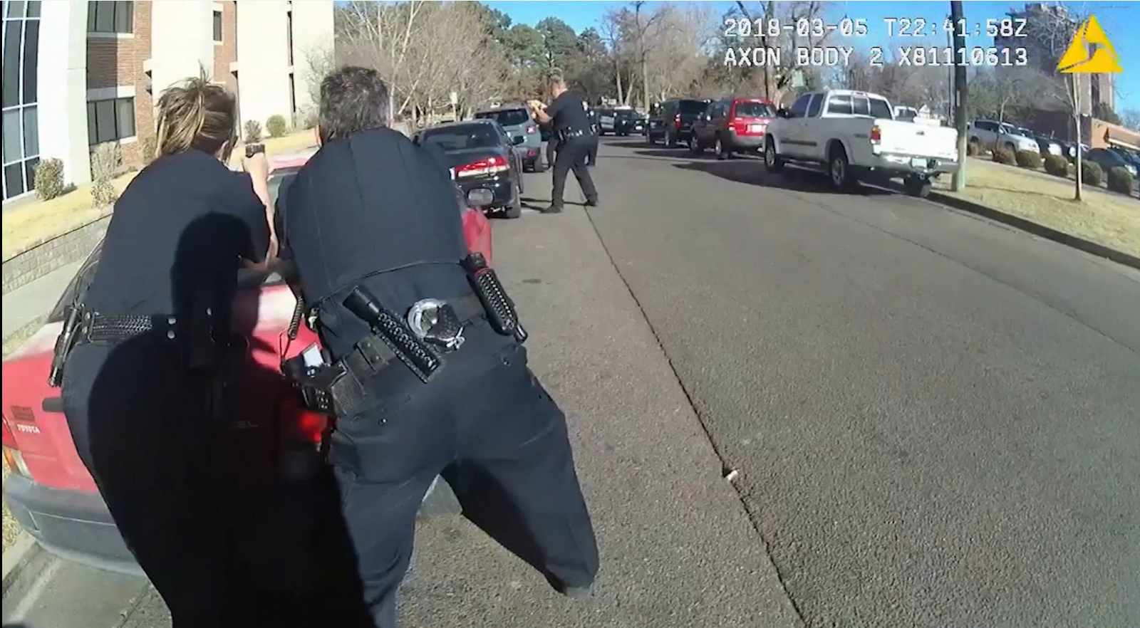As the standoff continues, other officers arrive at the scene, taking cover behind nearby cars. They all have weapons pointed at the man, ready to fire should he raise the handgun from his side toward Officer Jones.