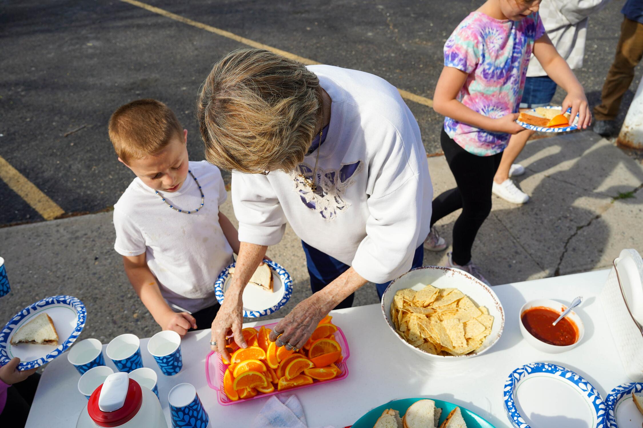 Volunteers finished cutting up oranges and brought PB&J sandwiches out to one of the picnic tables between the playground and the parking lot soccer game in the last weeks of the 2024-2025 school year. Inman, who runs the Hub, carried out one of the trays, thinking to herself that 16 kids is not that many. About 40 kids are enrolled in the free child care program, so some days can be much busier than this particular sunny Monday afternoon.