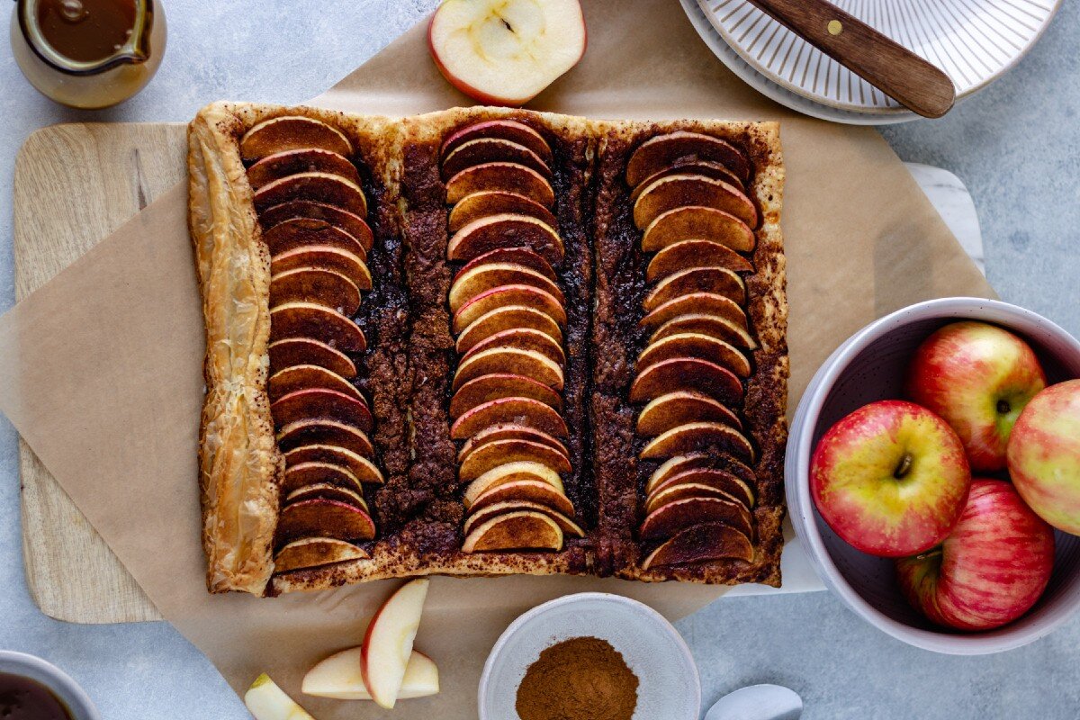 - Puff pastry sheet – Pro tip: Use the lines in the pastry as a guide to organize the apples. Be sure to also prick the dough with a fork to prevent it from bubbling up during cooking. (If this step is skipped, the dough puffs up and some of the toppings slide off).