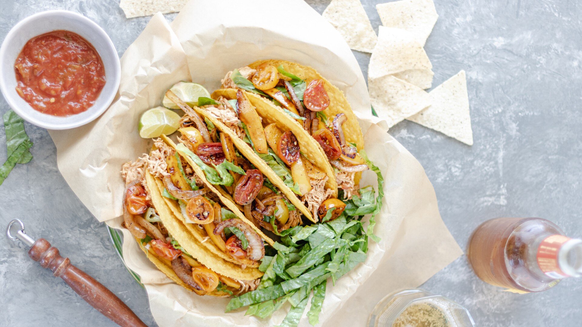 - Assemble: Top the tacos with the salsa chicken, shredded lettuce, sautéed pepper/onion mixture and avocado chunks. Serve each plate with a lime wedge.