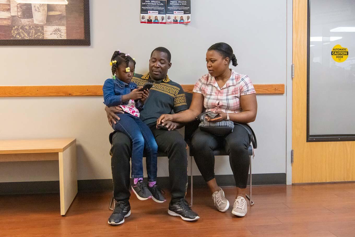 Tassy, her husband JN, and daughter Marlia, 5, wait outside a pharmacy for a prescription to be filled at Monfort Family Clinic on Wednesday, June 18, 2025, in Evans, Colorado. Photo: Tanya Fabian, special to The Colorado Trust