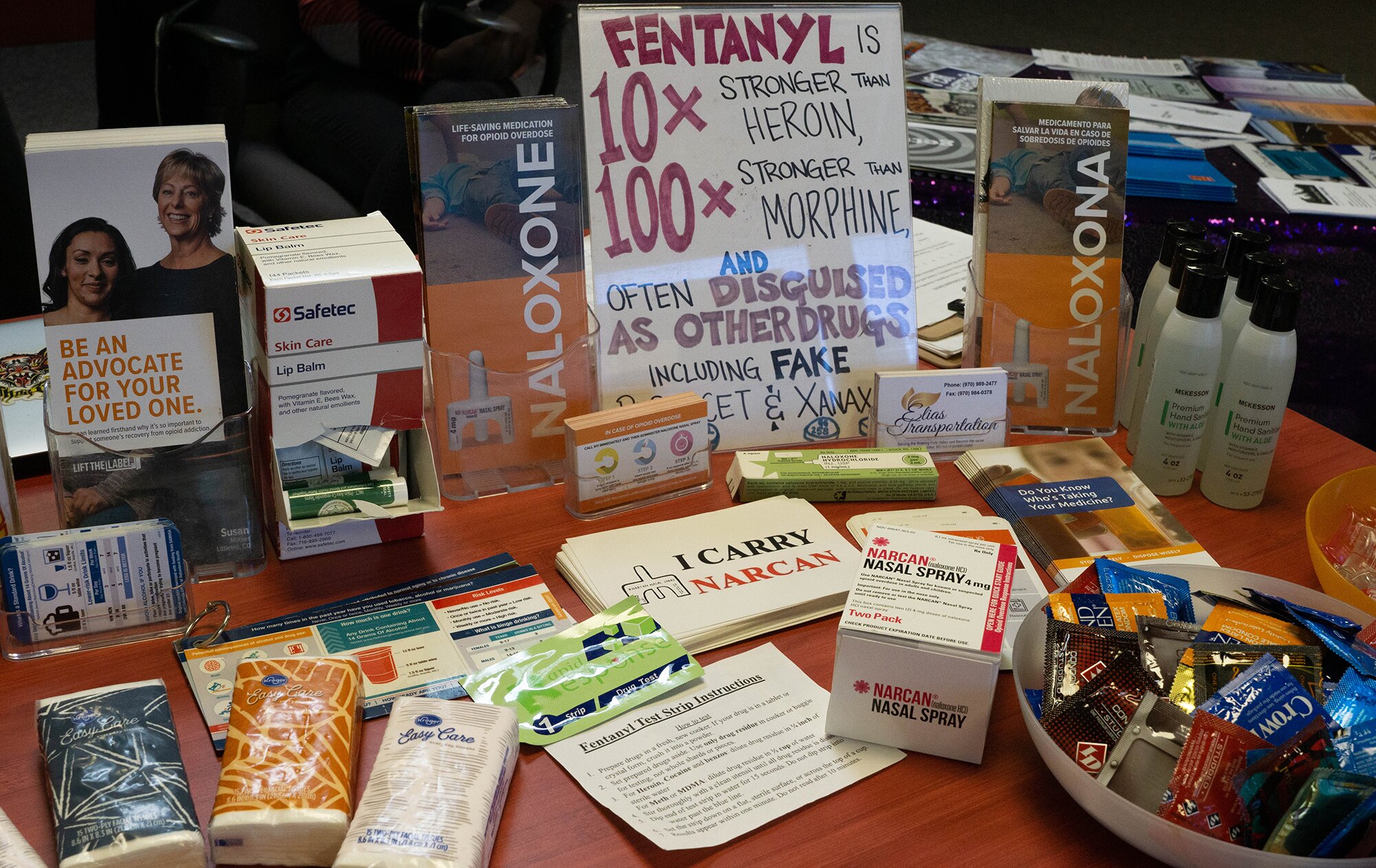 “Disposal, sterile equipment — we also do pipes and safe smoking, safe snorting equipment,” Seldeen said. “Whatever your route of administration. … We have fentanyl strips. We have mail-back ones with CDPHE where you can just mail it back yourself. Hygiene products, referrals, all that kind of stuff.”