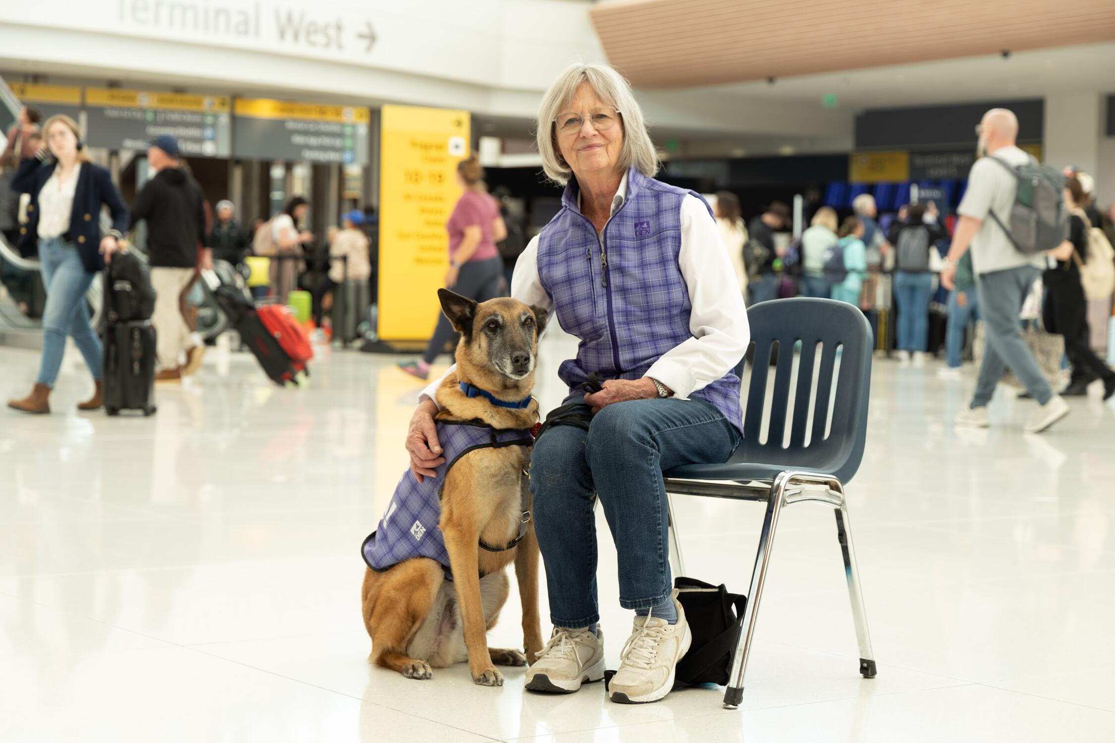 DENVER — When English Labrador retriever Galway dons her purple checkered vest and makes her rounds through the airport terminal, she’s officially on duty.