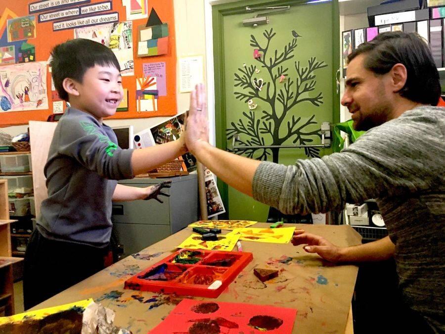 Graham Carson, a teacher at Denver Cooperative Preschool, finger paints with a student.