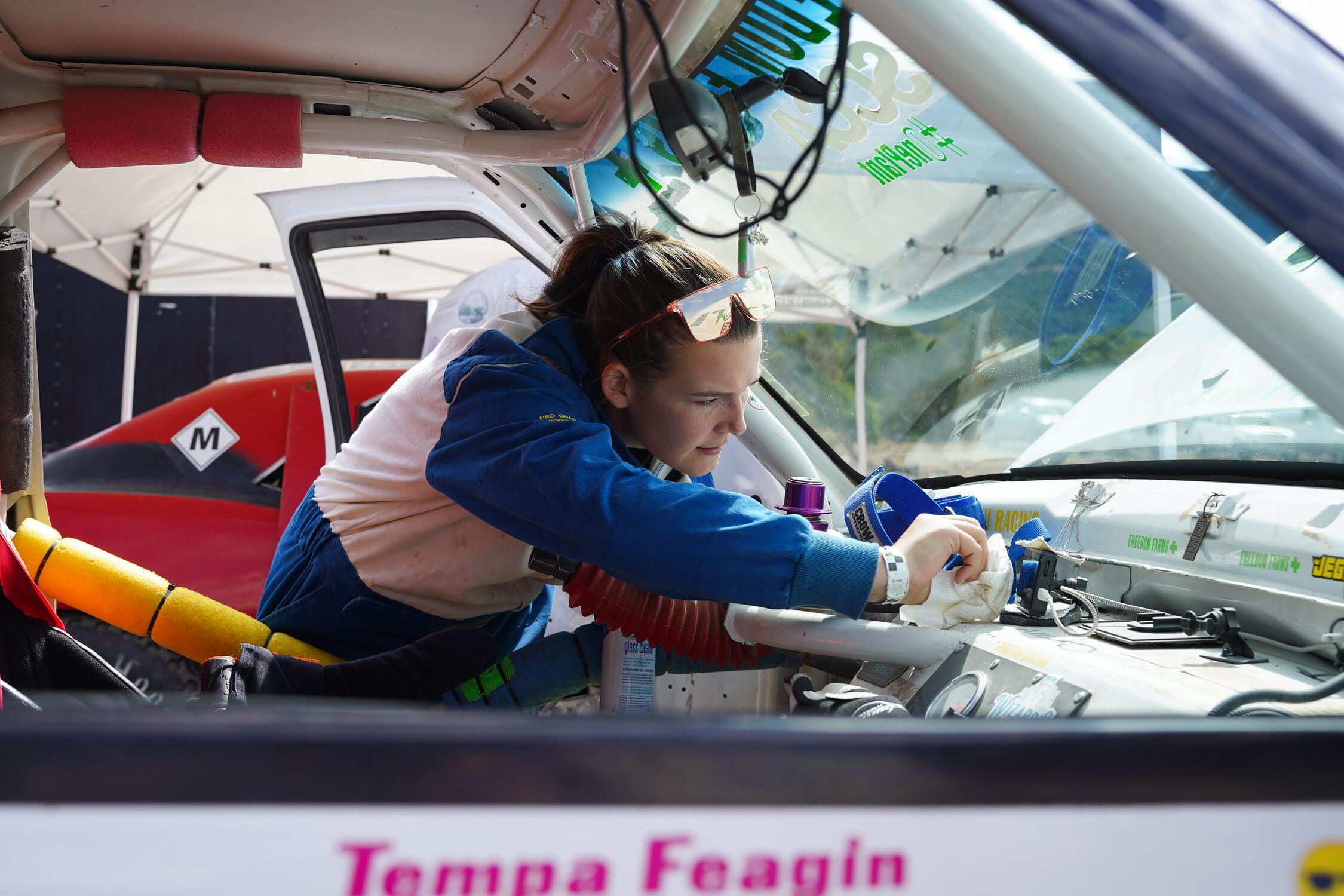 Feagin raced dirt bikes and ATVs in similar competitions the last five years. This summer is her first time in car #54, a custom Chevy S-10 pickup. Each type of vehicle races in its own category. Racers on dirt bikes, for example, do not compete against drivers in open-wheel cars. Feagin races in the “Comp Truck” division.