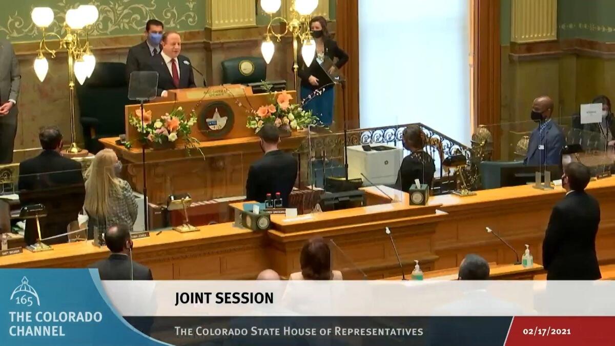 DENVER — Governor Jared Polis delivered his third State of the State address February 17 to a group of masked lawmakers and limited number of special guests at the Capitol.