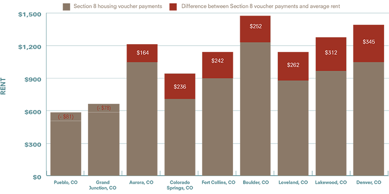 Housing vouchers issued under the Section 8 housing choice program don’t match average rents for one-bedrooms in many Colorado cities. Source (Colorado): Housing voucher payment standards from metro housing authorities; Rent averages from Rent Jungle as of August 2016.