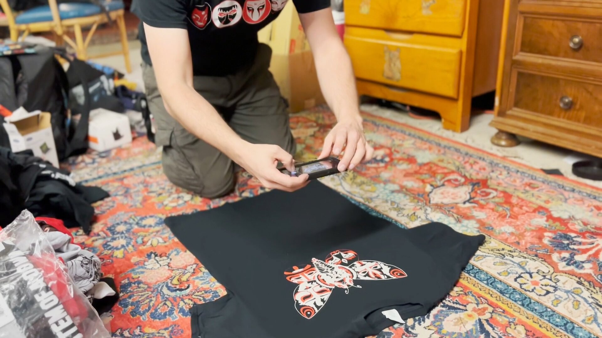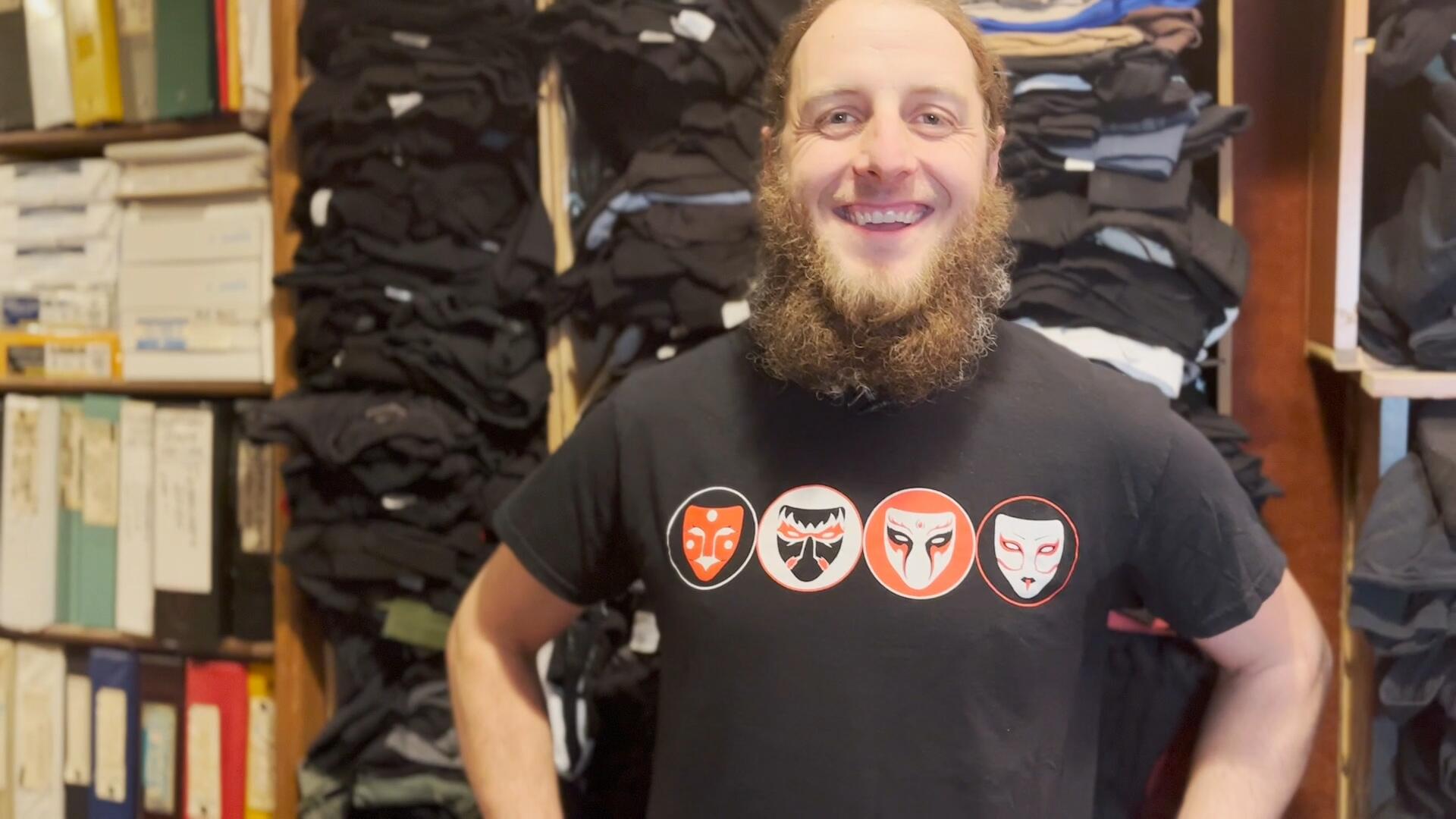 “This is the 772nd shirt,” he said during the interview. “This is a band called Daikaiju.”