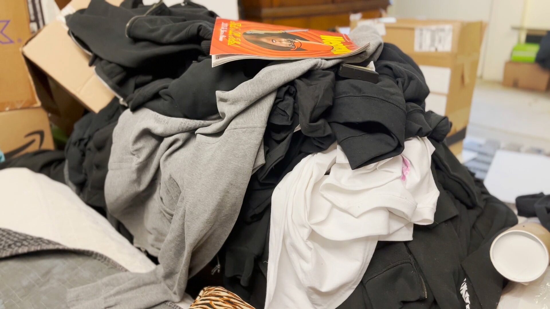 “And these are the rest," Saye motions, surrounded on all sides by boxes, piles, stacks, shelves and dresser drawers, all filled with t-shirts.