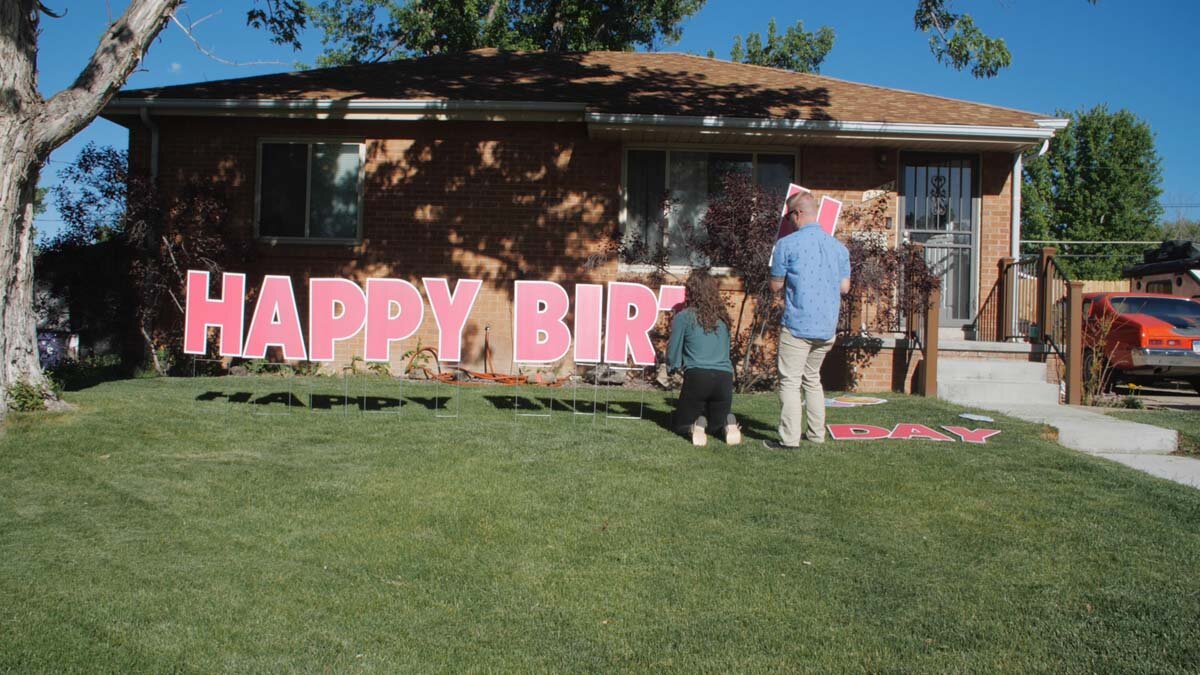 Carley and Bryan Carter are in their front lawn, carrying a stack of huge, bright pink letters. They carefully lay them out, making sure the words will fit. Then one by one, they start to push them into the ground, spelling out “Happy Birthday”.