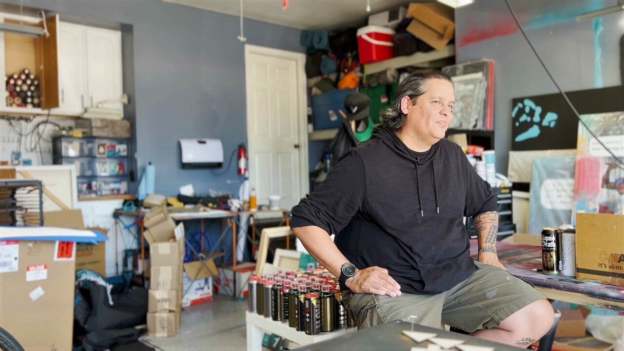 Gregg Deal’s artwork in his studio.