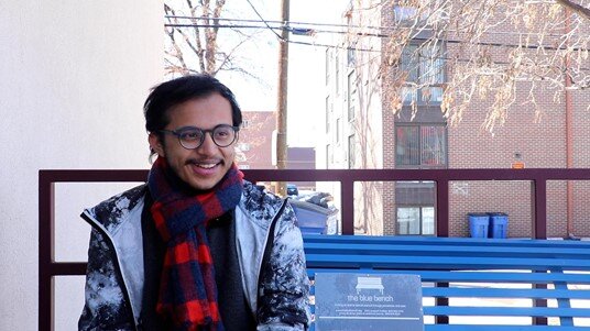 Resting on one of the blue benches-- commissioned by The Blue Bench-- outside of his university’s health and counseling center, Sudev explained his pain growing up in the Middle East. As a young boy, he felt hopeless after experiencing gender-based violence. Due to the “especially patriarchal” conditions in the area, he as a cisgender male felt he could never talk about and heal from his experiences.
