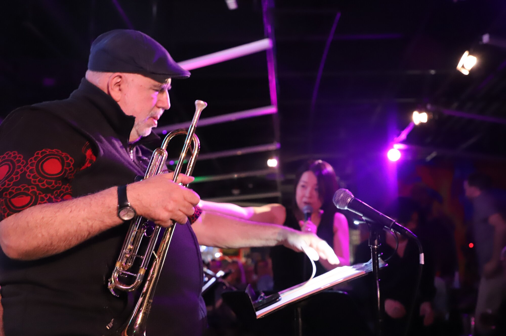 Randy Brecker prepares for a trumpet solo while Imaizumi conducts. (Photo by Elle Naef)