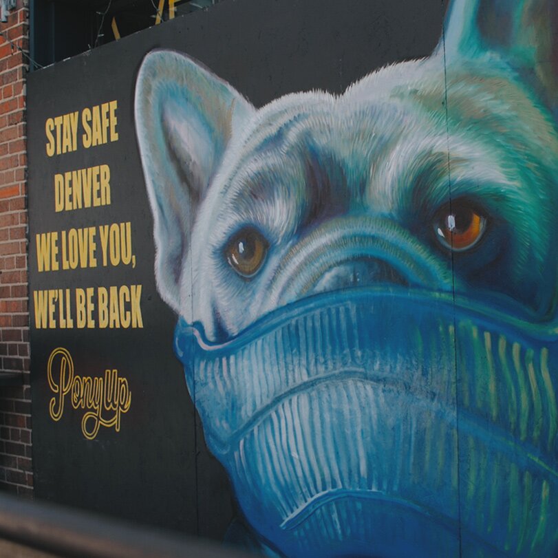 This is McGregor’s second post-Covid mural. “I kind of got the idea from another restaurant…when this first started they called me to paint their window.” His first mural can be found outside of downtown restaurant Pony Up. It depicts the owners’ French bulldog wearing a mask and the words “Stay Safe Denver. We Love You, We’ll Be Back” next to it.