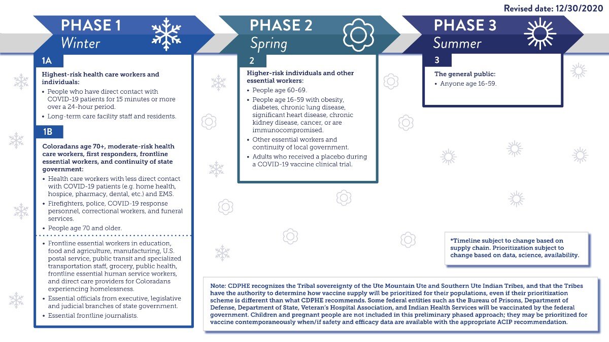 Colorado is currently in Phase 1A of the vaccination distribution plan. In this phase, front line health care workers with exposure to COVID-19 patients are first in line to receive the vaccine, as well as staff and residents of long-term care facilities.