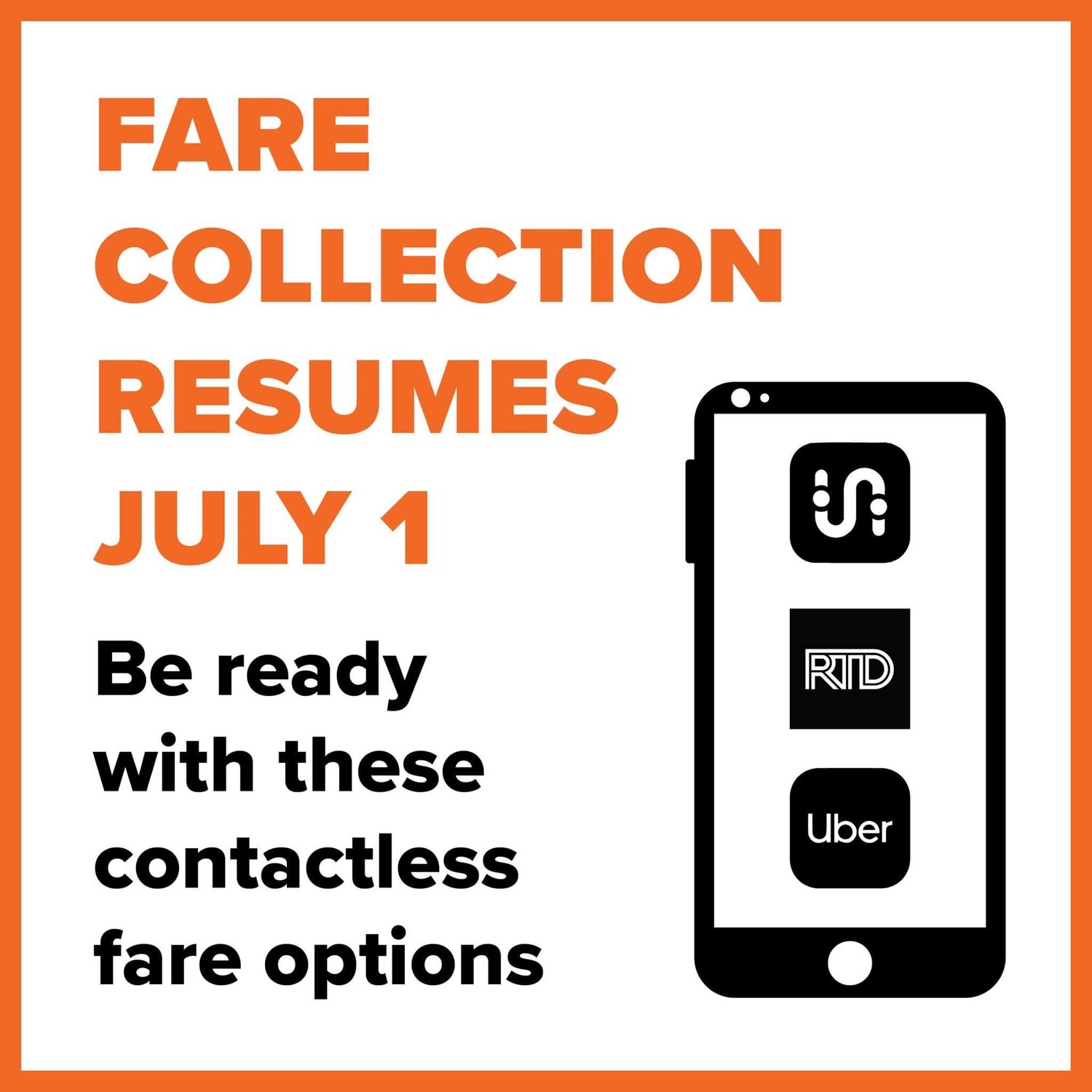 - Contactless payment options including the RTD Mobile Tickets app, the Uber app and the Transit app, to avoid contact with the fare box on buses