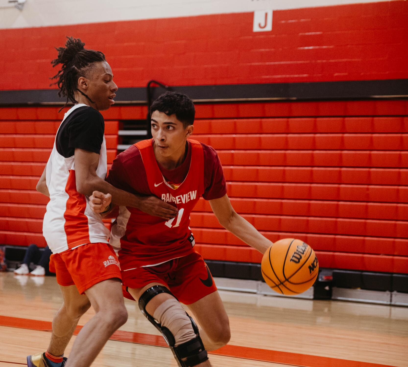 AURORA, Colo. — The sound of squeaking sneakers penetrates the red doors of the Rangeview High School gymnasium. Inside the gym, dozens of student athletes clad in white and red are running across the slick floor. The vibrations of bouncing basketballs echo as players yell at each other to cut, pass, and shoot.