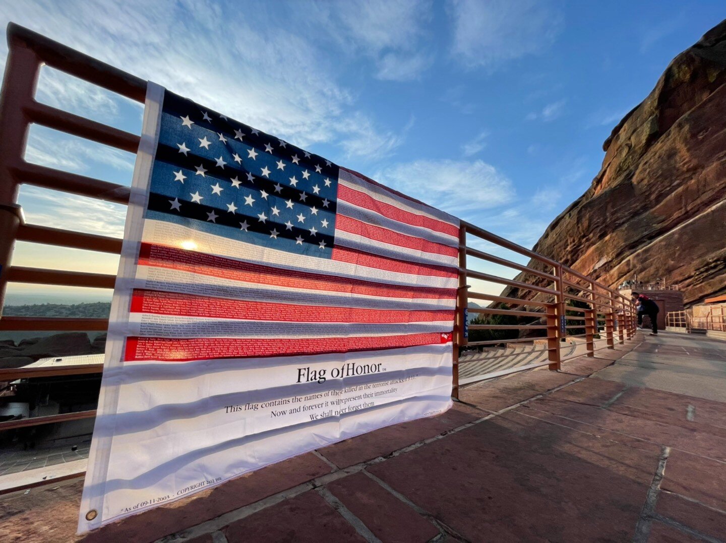 At the top of the Red Rocks stairs Saturday was a “Flag of Honor” — an American flag containing the flags of all the 9/11 victims in miniscule font. Sheryl Cochran of Lakewood is the flag’s owner.