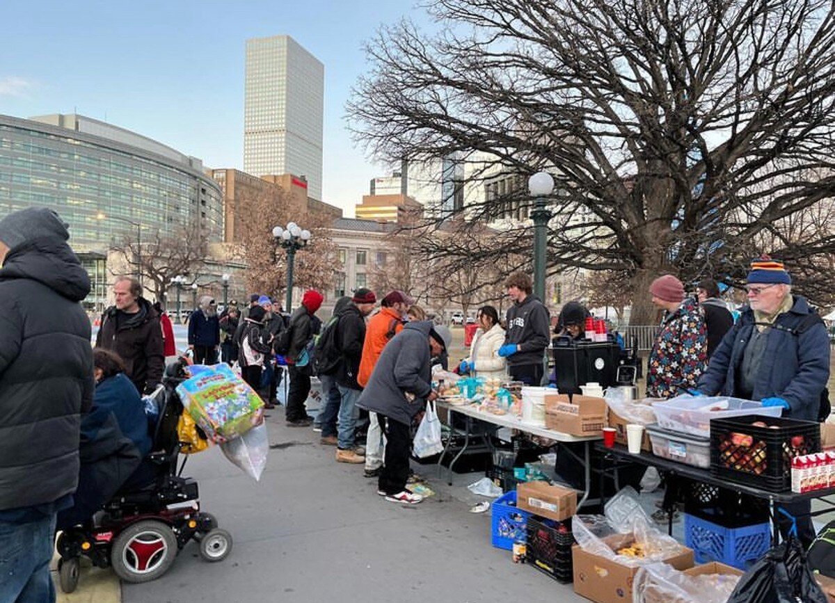 Volunteers stand outside scooping pasta and soup into paper bowls, giving out bags of snacks and handing out camping gear to people experiencing homelessness in Denver.