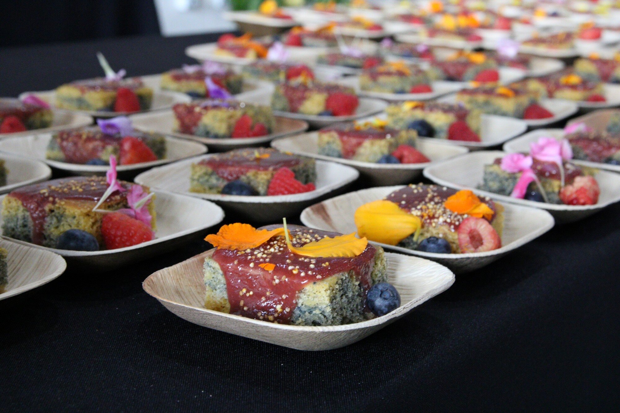 Murdoch places edible flowers on top of her Ute Mountain Ute blue cornmeal swirl cake at the Denver EATSS event. Other ingredients feature in the cake are pureed roasted squash, raspberries, blueberries and popped amaranth.