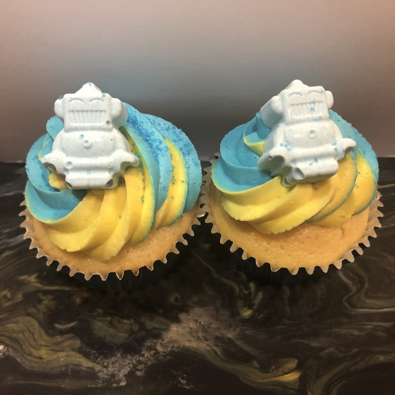 As the menu describes, “a vanilla cupcake with a blue and yellow swirled buttercream to represent STEM's colors and a chocolate robot to honor Kendrick's work in robotics.”
