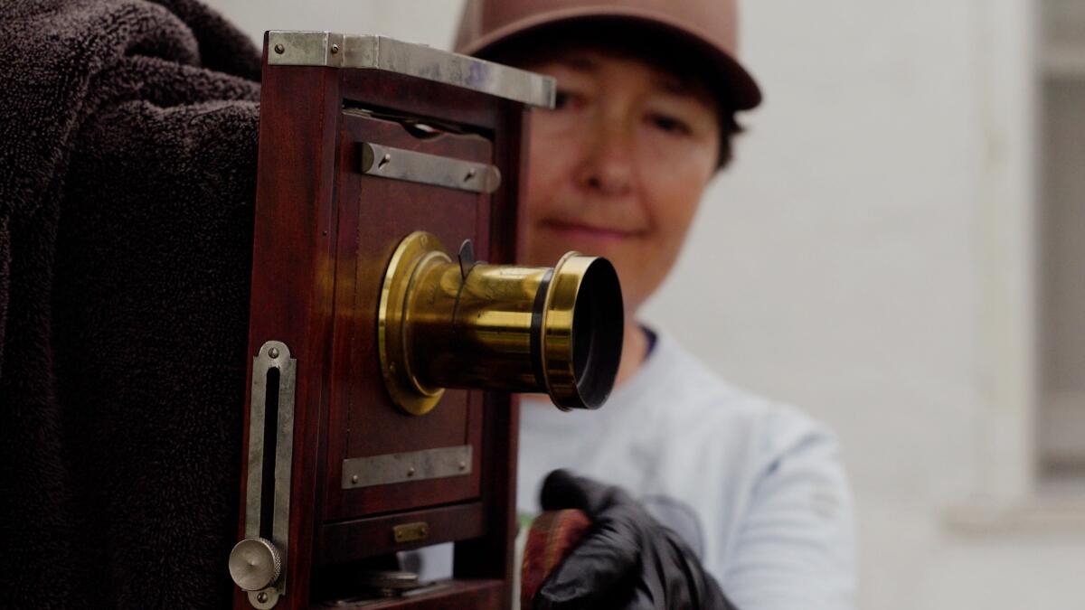 Ford now inserts the prepared tin plate between the ground glass and the lens in a light-tight plate holder. Then she pulls out the dark slide and the camera is ready to take a picture. Ford gently removes the old lens cap. There is no shutter, no click. Removing the cap is how light is let into the camera.