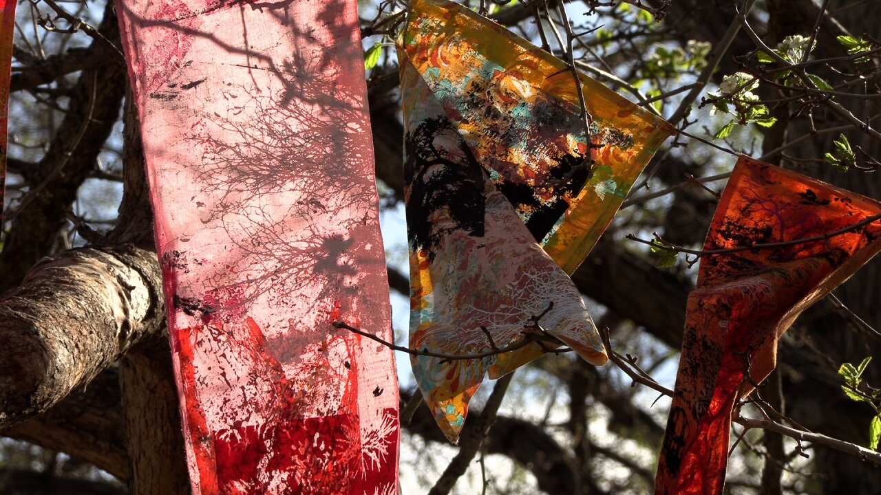 The outdoor exhibit is located in La Alma Lincoln Park within a Historic District of one of Denver's oldest neighborhoods. You'll know you're in the right spot once you see eight trees lined with a total of 80 colorful handmade flags. Epperson and 16 of Arts Street’s participants created the fabric adornments through a screen-printing technique they learned at Ink Lounge.