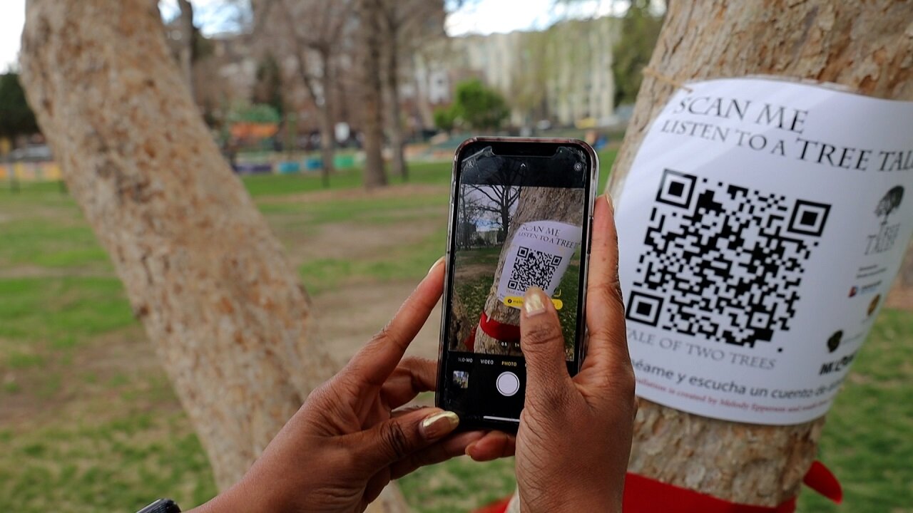 QR code posters attached to the trees provide additional interactive elements, each bearing a different code. Once the code is scanned via smartphone, visitors are directed to the Tree Tales website where they can listen to eight unique stories recorded by youth participants of Arts Street. The stories range from fiction to short biographies.