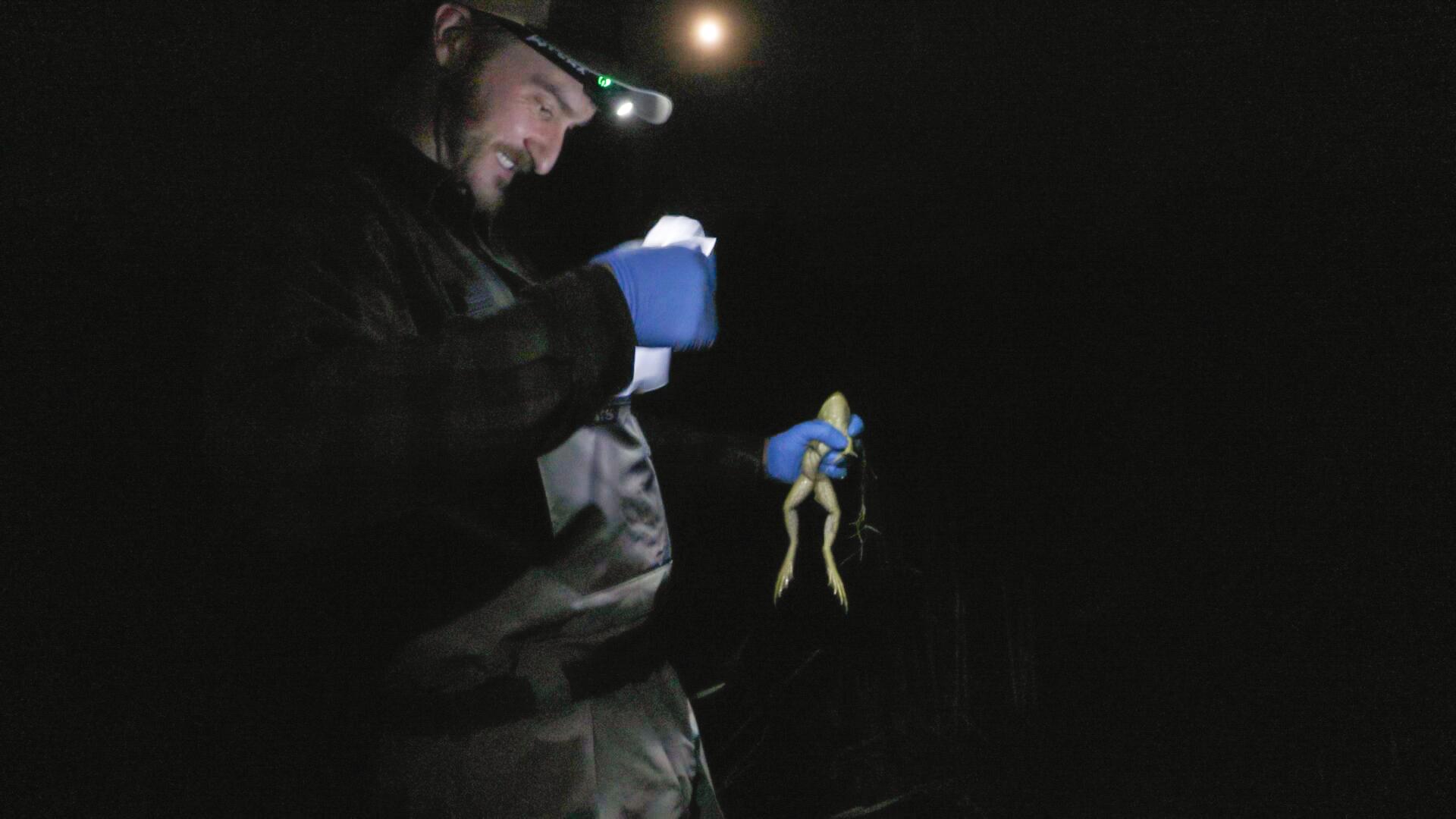 He spotted one in the cattails, training his headlamp on it. The light sets off a freeze response in the creatures, letting Kopperud inch close enough to grab the frog with a blue-gloved hand.