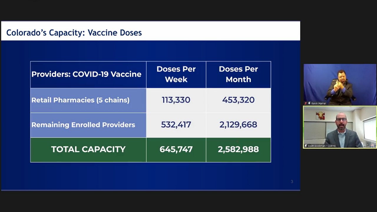 Analysis with the state, health care agencies and other partners that provide the COVID-19 vaccine showed how much the state could handle as far as vaccine distribution. Scott Bookman, the COVID-19 incident commander with the Colorado Department of Public Health and Environment (CDPHE), said the state could give out more than 645,000 doses per week, and more than 2.5 million in a month.