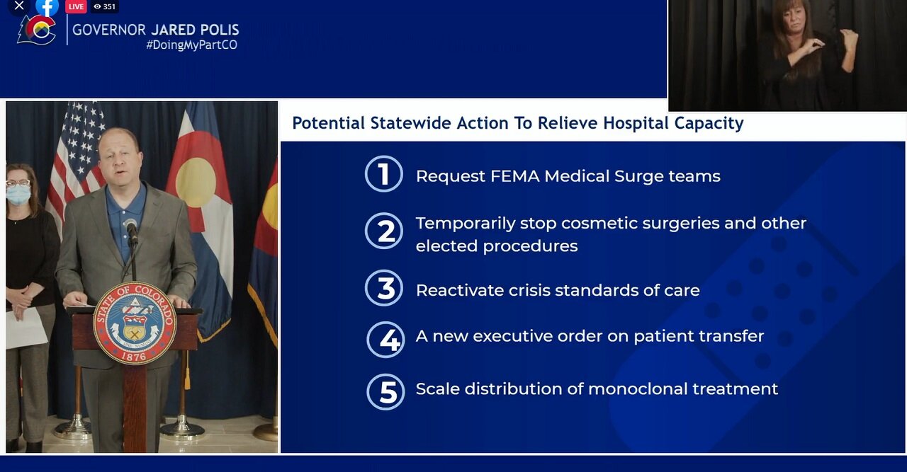The governor said the way the numbers are trending the state is looking at taking five actions to help relieve hospital capacity. When asked by a journalist if there would be a reinstituted mask mandate or vaccine mandate, Polis referred back to these five actions to take first.