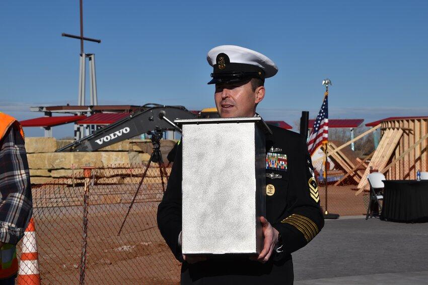 U.S. Navy Command Master Chief Benjamin Chester, a 22-year veteran who has deployed on three different ships, gave of speech on what the stepping of the mast means and the ceremony's history.