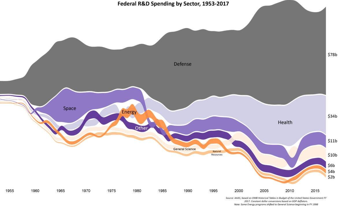 Energy is that tiny orange sliver — 2 percent of the total pie of R&D funding on average between 2000 and 2017, or an average of $2.2 billion a year. Compare that to defense R&D, which averaged $78 billion a year over the same time period, or 56% of all R&D spending.